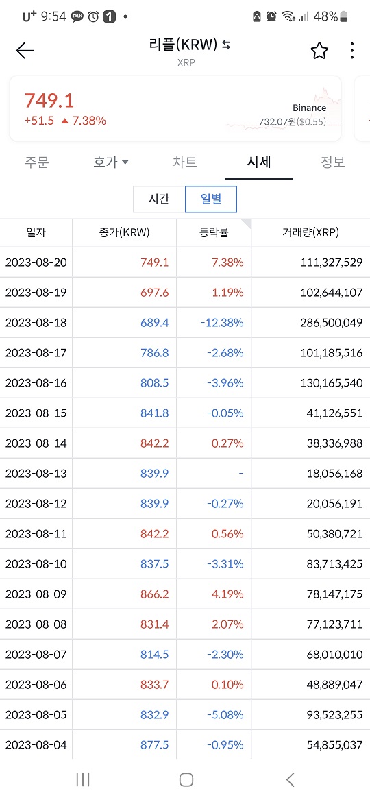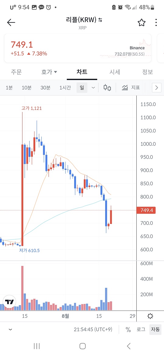 리플은 최고 1.121원까지 초고점을 찍었다가 현제 시세는 하락하다 상승하여 749원 때를 유지하며 횡보 중에 있습니다.