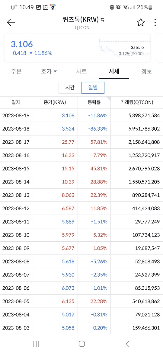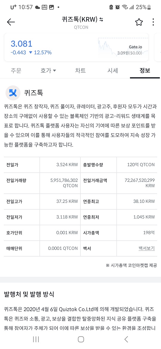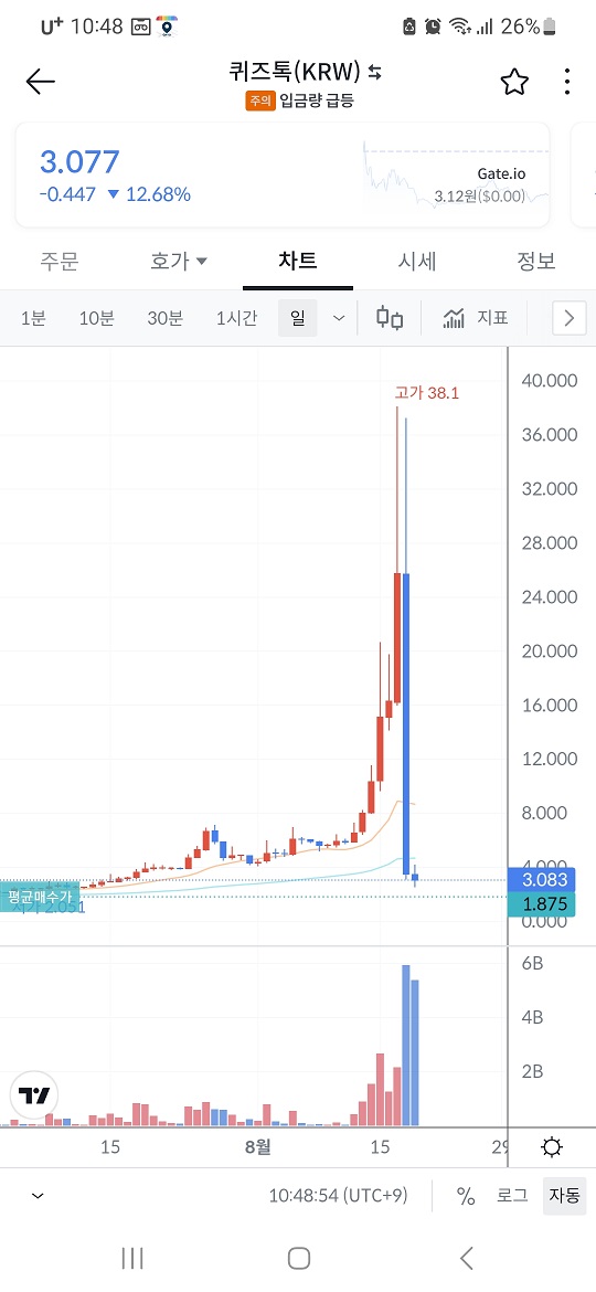 퀴즈톡 코인은 연중최고 38.10원을 기록했고 금년 4월 제가 매수할 때만 하더라도 1.875원이었는데 금년 6. 중순부터 꾸준한 상승을 통해 최고점을 찍었다가 현재는 이틀 상간에 급격한 하록으로 3.072원에서 횡보 중에 있습니다.